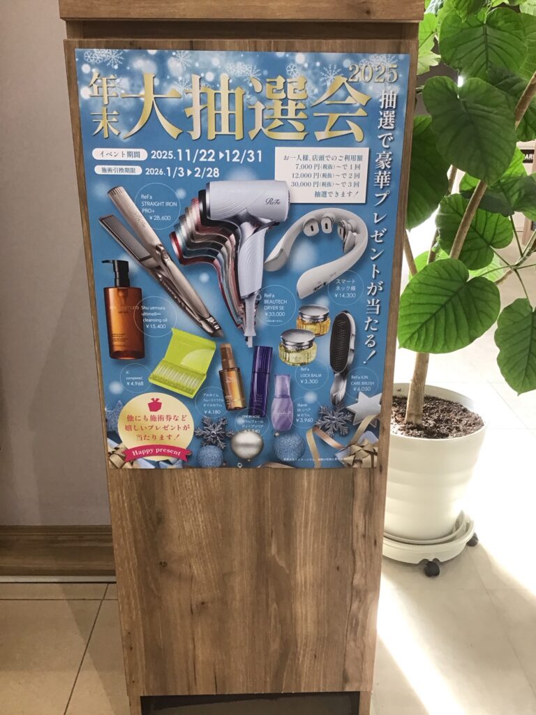 11月22日スタート✨ Published 2025年10月29日 今年もやります❗️ 年末大抽選会❗️ ご利用金額によりくじ引きできます(о´∀`о) 髪もキレイに(^○^) くじ引きで得しちゃいましょう✨ 年末ご予約混み合いますので、 ご予約お早めにお待ちしております(*^^*) スタッフ一同お待ちしております♪ Published in 未分類 Previous Post 講習会♪ No Newer Posts Return to Blog