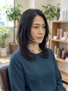 肩の上から鎖骨あたりまでの長さ・ミディアムヘアは、ダウン・アップスタイルどちらでも楽しめて、髪質や外見の悩みが増える40代にマッチする髪型のひとつ。