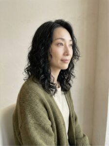 パーマをプラスしたミディアムヘアは、まるで海外女性のような華やかさと若々しさが引き立つ、理想のスタイル。